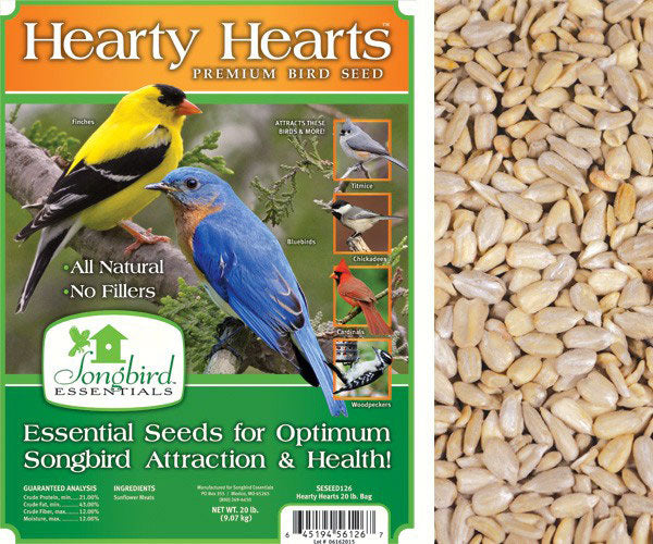 Songbird Essentials Premium Bird Seed is designed for optimal Songbird attraction and health! All Natural with No Fillers! Hearty Hearts contains Sunflower Meats. Attracts Finches, Bluebirds, Titmice, Chickadees, Cardinals, Woodpeckers and More!